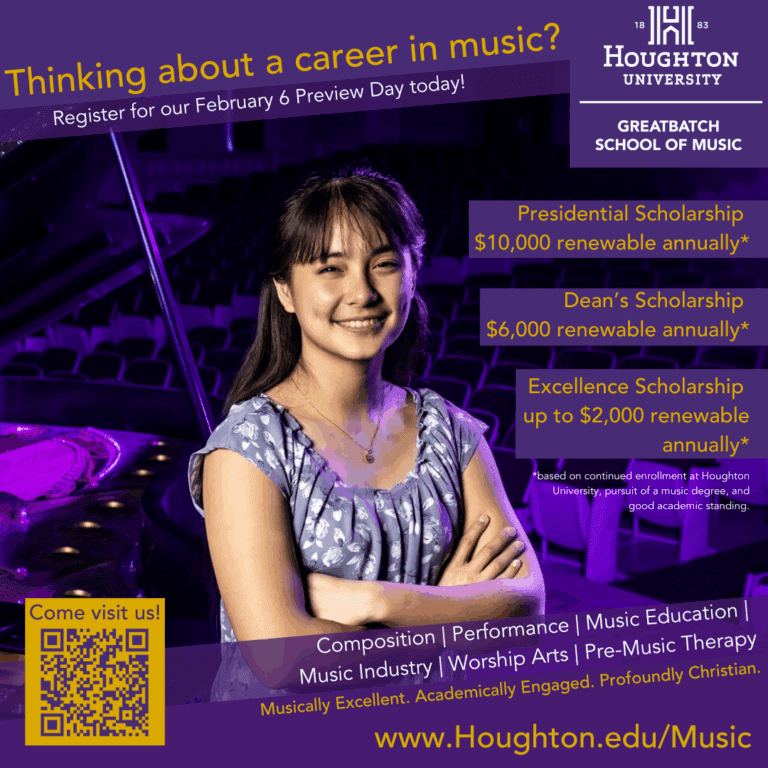 The Greatbatch School of Music at Houghton University facilitates your growth as an excellent musician and lifelong learner prepared to serve others with the gift of music through opportunities for collaborative music-making, including practice, study, and performance